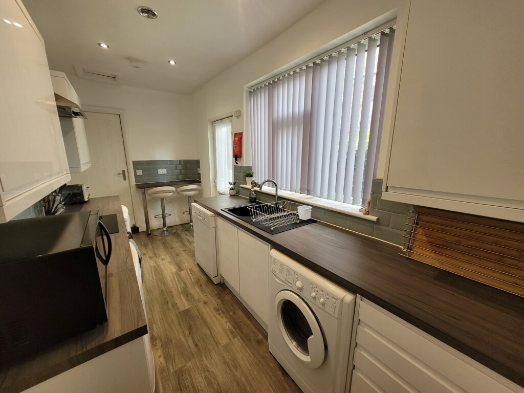 The sleek galley-style kitchen is fully equipped with modern appliances, including an electric hob, oven, microwave, dishwasher, washing machine, and fridge freezer. The smart layout and glossy tiled backsplash make cooking here a pleasure.