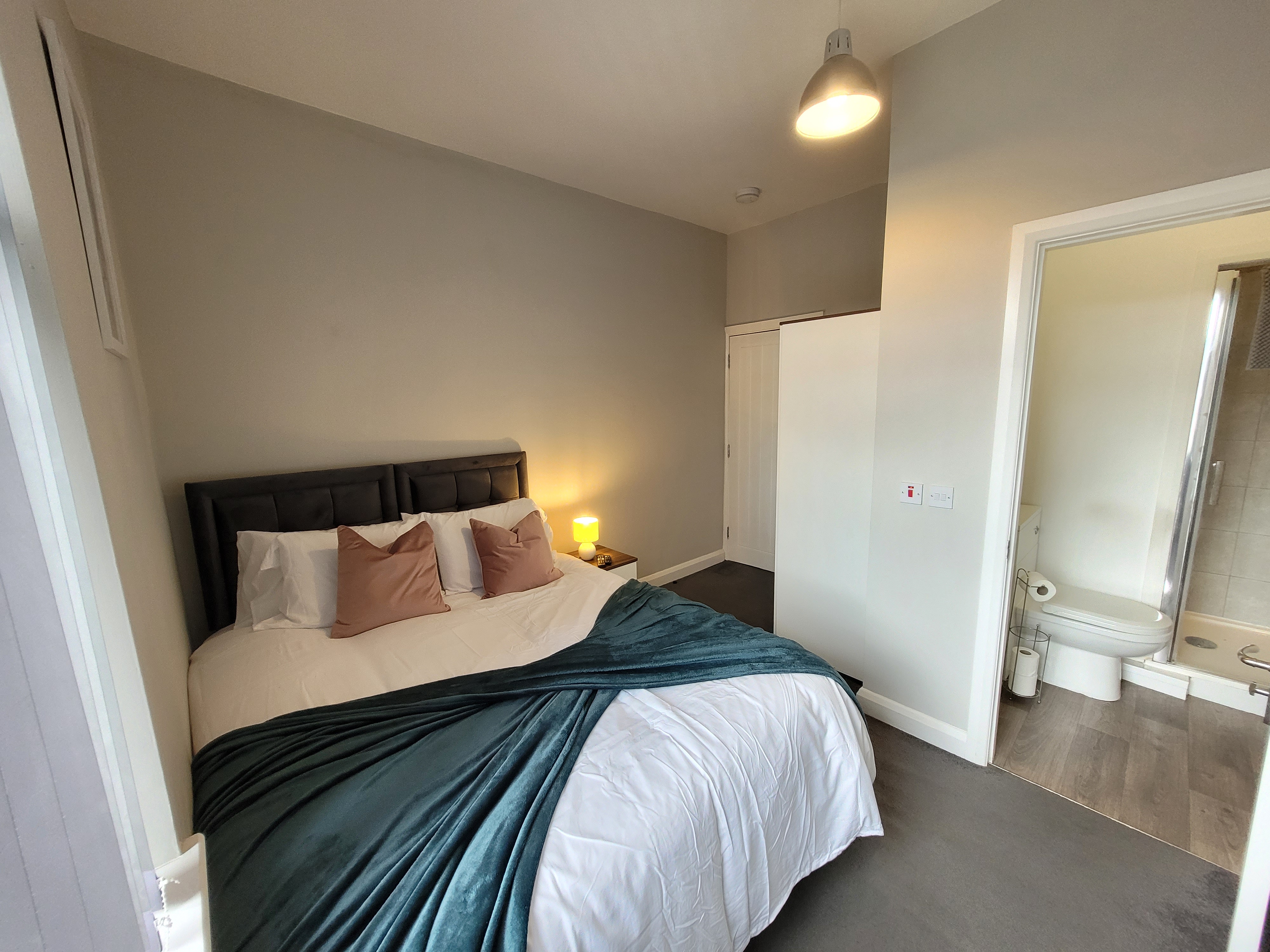 Master Bedroom (Upstairs, Ensuite): A serene retreat with a plush double bed, cosy bedding, and its own smart TV. Perfect for relaxing after a day exploring.
